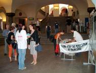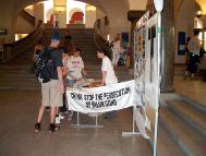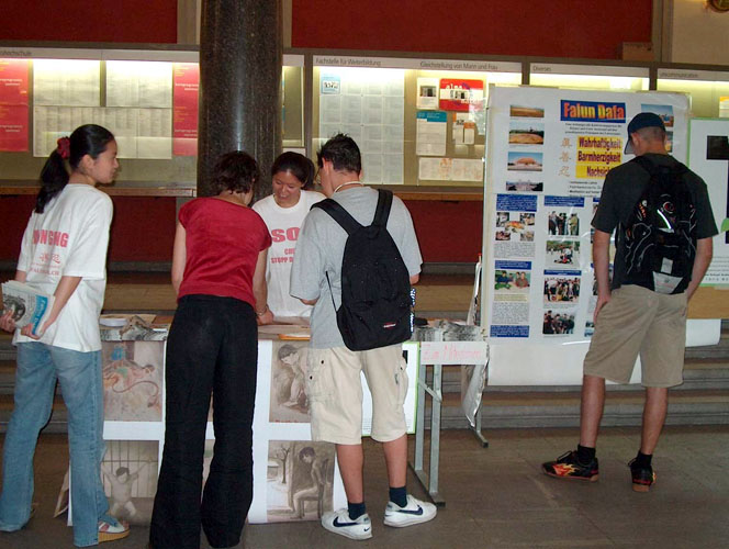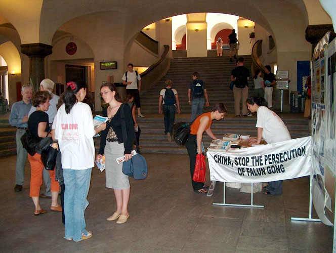 受害者国际日,瑞士法轮功学员在苏黎世大学(University of Zurich)前厅洪法、