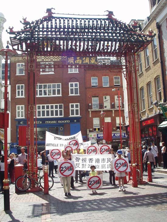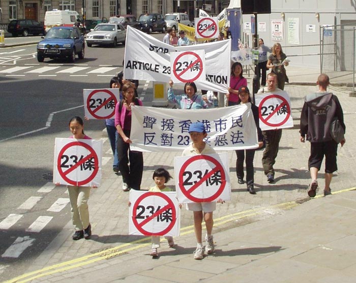 新闻发布会结束后,游行队伍从伦敦中使馆前集合,然后开始了穿越伦敦繁华的购物街区,至著名的中国城结束的反二十三条游行。整个游行队伍肃穆有序,由三个手执“二十三条禁行”标志图板的孩子带头,紧接着是“声援香港市民,反对23条恶法”,以及呼吁“守住香港,守住良心” 的条幅紧跟其后。