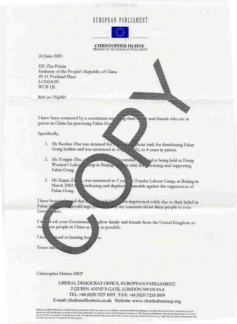欧洲议会议员克里斯多夫-胡内就法轮功学员受迫害一事致信中国驻英大使