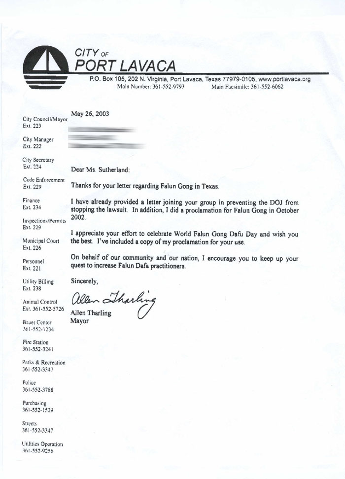 艾伦.撒令先生在回信中还附上了去年十月江××访德州时他颁发给法轮大法的褒奖,宣布十月为波特拉瓦卡市“法轮大法月”