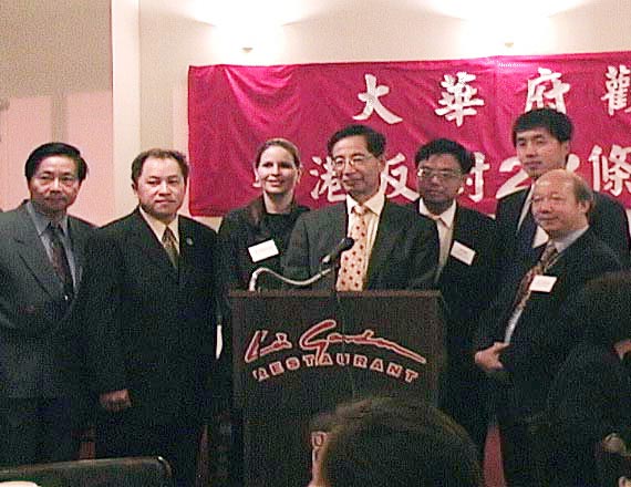 涂谨申表示,我们理解,董建华获连任,是以答应北京在香港进行23条立法并达到取缔法轮功为条件的,中央政府高级官员多次在香港强调,法轮功不应该存在。中央给特区政府很大压力,否则董建华也不会匆匆立法。他说,在华府游说期间,获得广大支持,所到之处都在询问:“我们如何帮助你们?”
