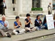 中午12点30分,一位西人学员宣布新闻发布会正式开始。来自古德弗市的海伦·茜彻第一个发言,然后,90岁高龄的法轮功学员,瑟罗勋爵发表演讲,他讲到,这一年的不间断和平请愿是了不起的,因为这是为了抗议已持续4年之久的人类历史上最大规模的,这场迫害是中国政府针对他自己的人民进行的,而这些被迫害的人民所涉的唯一“罪过”仅仅是坚信一个和平的非暴力的精神信仰。最后,他呼吁:“我们呼吁英国所有的人共同加入这一抗议行列,更深刻地理解正在中国发生的邪恶。”最后,法轮功学员罗伯特·基普森代表参与绝食的学员宣读了绝食申明,声援被非法关押在中国监狱、正在绝食抗议的美国公民李祥春医生。
