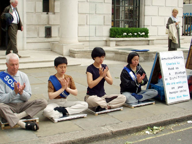【明慧网2003年6月7日】6月5日,是英国法轮功学员在中使馆前24小时不间断和平请愿一周年的日子,英国法轮功学员为纪念这一具有历史意义的一天,在中使馆前召开了新闻发布会。并以此声援大法弟子在美国芝加哥起诉江××的正义之举和声援正在中国监狱绝食抗议的美国公民李祥春医生。