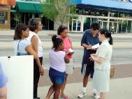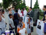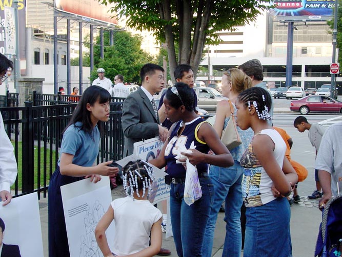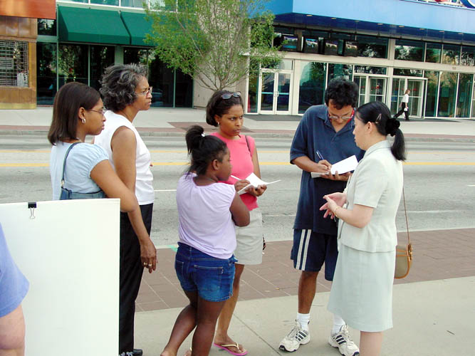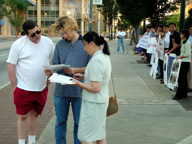 很多路人都主动来询问、索取真相资料,纷纷在为营救李祥春的请愿信上签名,呼吁美国政府敦促中国政府停止迫害人权,立即释放李祥春。当一位学员给一位过路的妇女一份传单后,告诉她李祥春正在因绝食而被中国政府粗暴强迫灌食时,发现她把目光马上转向了她身边的大女儿,那女孩打起了手势给她看,这位学员才知道她是一位聋哑人,学员讲一句,女孩用哑语翻译一句,那位妇女一直认真地看着女儿的手势,不住地点头表示她明白,学员也尽量用小女孩能明白的语言向她们讲着,最后她拿起笔签下了她的名字Sharon,当学员看着她的眼睛慢慢地向她念她的名字的时候,她高兴地笑了。