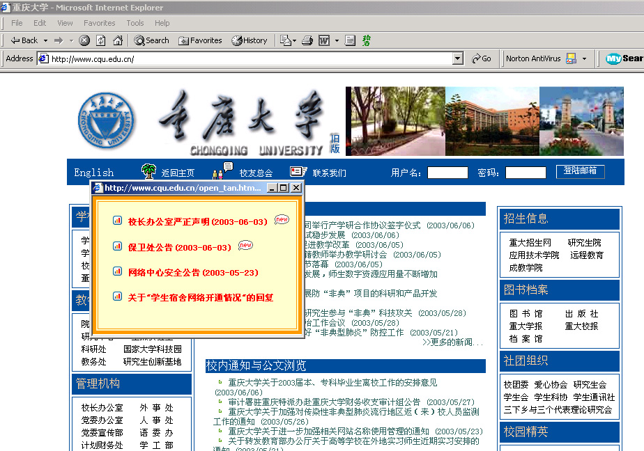 ![]() 重庆大学网站首页弹出声明和公告 |