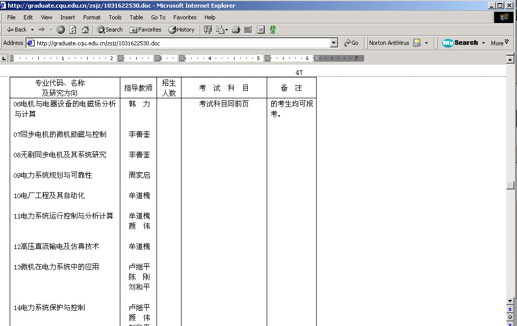 8。打开WORD文件一看,找到电气工程学院,它下面第12号专业,赫然就是“高压直流输电及仿真技术”,导师“牟道槐”。“高压直流输电及仿真技术”这么长的专业名,叫它“高压输电”太合情合理了。重庆大学的学生,说到“高压输电”专业,有多少人会去争论它是别的专业而不是“高压直流输电及仿真技术”专业呢?电气工程学院在发布的公告中否认这个名称,却又在学院自己的网页上不敢让人看到这个专业 (点击系名只是弹出一个空框框啊!),岂不是做贼心虚?