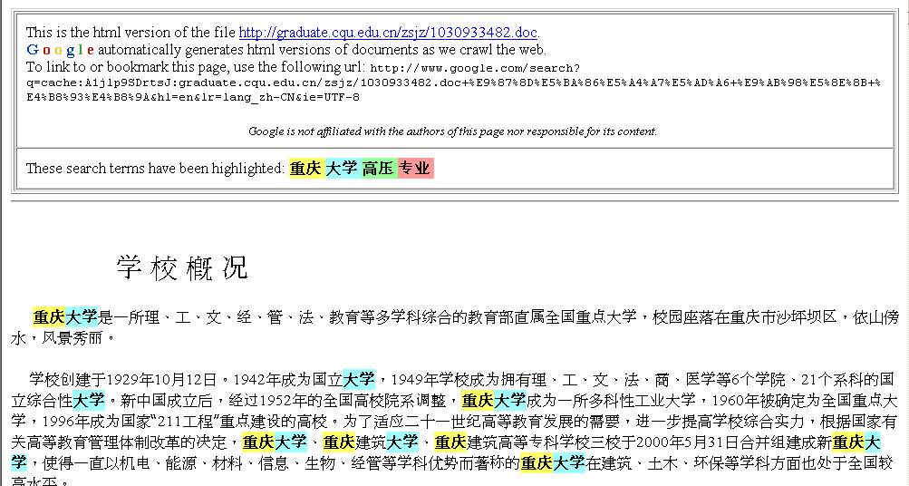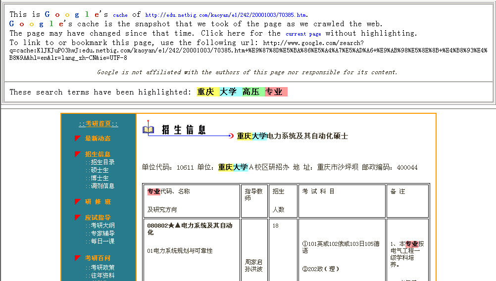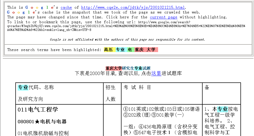 刚刚看了大.纪.元;上有关重庆大学网站删改专业的报道,笔者在重庆大学的网站内的研究生招生简章的word中找到了“高压直流输电及防真技术”专业,为防止重庆大学校方再次销毁证据、删改有关文件,这里提供了在Google上搜索到有关这个专业的三个不同网站的文章,由于Google本身自带的网页快照的强大功能,将网页内容都储存在Google自己的数据库中,即使网站本身删除了有关页面,但在Google的网页快照中仍能找到。