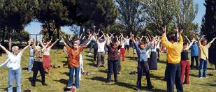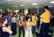 一走进博览会入口大门,首先映入人们眼帘的便是在草坪上正在展示优美功法的法轮功学员们的身影。不怪人们说“法轮大法是健博会的一道特殊景观”。博览会主办者也开玩笑地对我们说:“你们法轮大法快成了博览会的专场展示会了。你们知道吗?法轮大法是唯一享有可以在室外展示这一特权的参展者。”