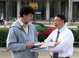 当问到他怎么看横幅上写的“公审江(泽民)”时,于先生说:“非常有意义。法律面前人人平等。江泽民迫害法轮功,犯了群体灭绝罪,不仅天理不容,也应受到法律制裁。审判江是他个人的事,与中国政府是两回事。法轮功学员依靠事实,依靠法律,和平理性的抗争在中国历史上开了先河。对中国未来将有深远影响。”