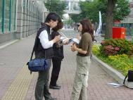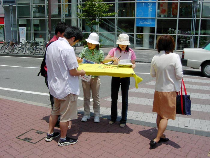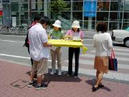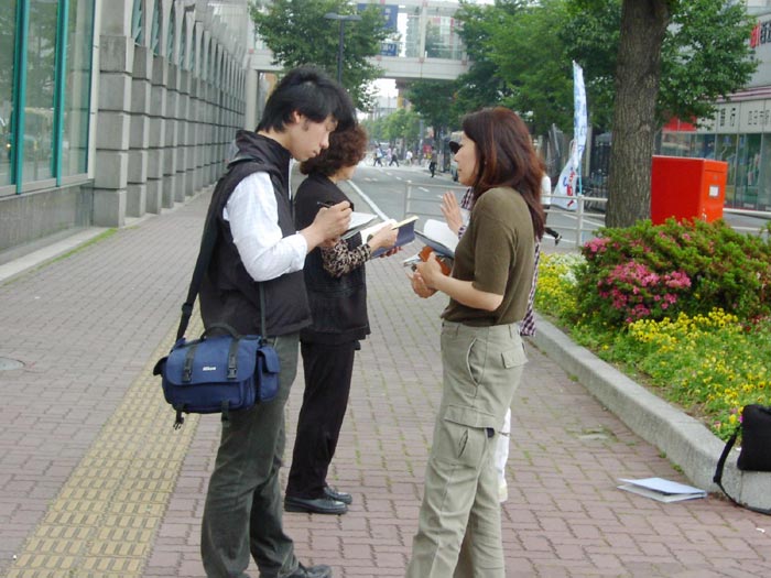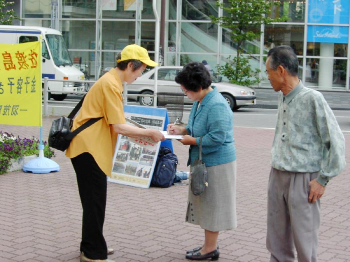 6月7日一大早,学员们坐乘长途列车来到距大阪约一百多公里的三重县,为营救金子容子征集签名。上午,征集签名活动开始后,便开始有不少市民应征签学员的要求前来签名。而后,有不少市民在看了传单后主动前来要求签名。