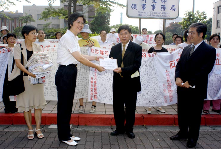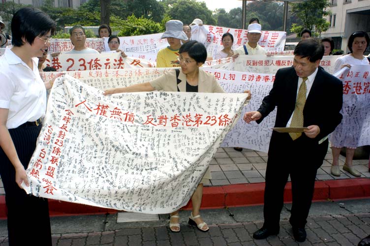 6月30日下午,台大新闻所教授张锦华,偕同该联盟60余位反对23条立法人士,前往陆委会递交反对声明书及签名,希望港府能重视海外的声音。