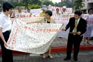「全球反对23条立法联盟」60多位成员,一字排开在陆委会大楼前的入口处展示签名布条,布条上写着斗大的「反对侵犯人权、反对香港第23条立法」、「支持人权、珍惜自由」等字样,引起不少路人的注意。