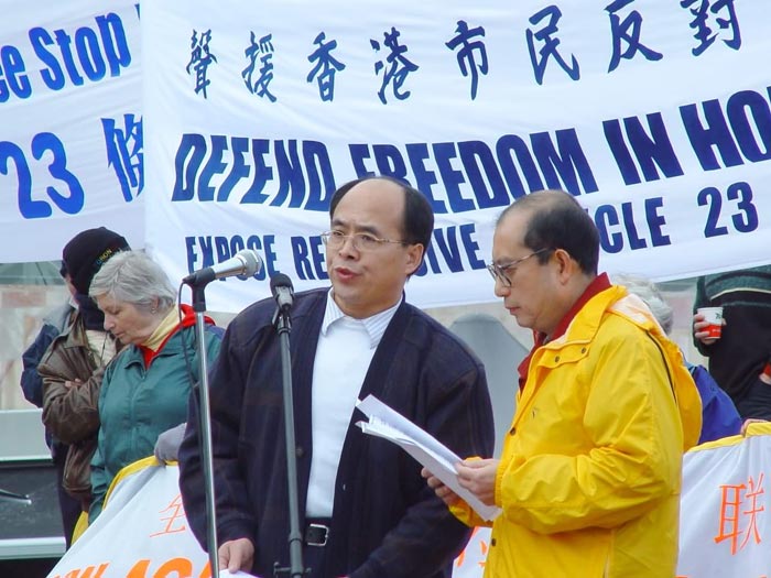 民运代表阮杰先生表示,言论自由是最基本的人权。他说,人区别于动物的根本就在于人有思想和感情。因此,表达出所思所感是人的天性,无论任何国家、政党和组织都不可以剥夺。然而在中国,人们没有这项自由,若公众的言论不符合党的“指导方针”,他们就可能被监禁或虐杀。在中国,所有的新闻传媒都由政府控制监管,为了维护极权统治及掩盖官员的腐败真相,共产党遏止民主运动,将持异见者投入监狱,使其遭受肉体和精神的折磨。共产党剥夺了人们的言论、结社和信仰自由,这非常不人道,是与人类文明背道而驰的。共产专制不但损害了中国人民的利益,也危害了全世界,这一点从SARS事件即可得到证实。香港是一个自由民主的社区,我们拥护香港回归,但我们不能接受中国政府背信弃义,将恶法23强加给香港人民,剥夺了香港的民主和自由。我们强烈反对23条,也希望全世界都来关注中国的人权状况。