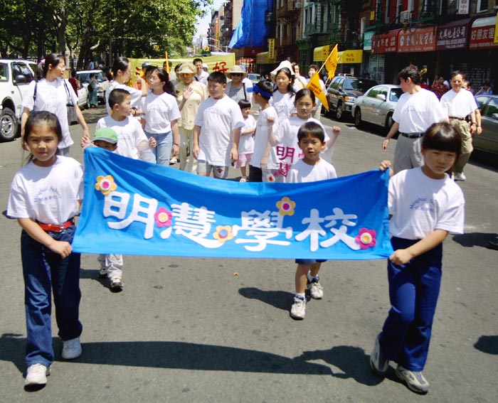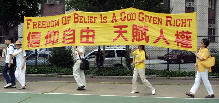【明慧网2003年7月14日】“信仰自由、天赋人权”- 七月十二日中午,法轮功学员打着醒目的标语在纽约唐人街举行盛大游行。醒狮开路,一路锣鼓喧天,喜气洋洋,三百多人的队伍浩浩荡荡,集传统修炼和中华文化于一体,成为今夏的一大亮点。法轮功学员为了庆祝美国公正、自由的建国精神,感谢美国政府和人们对于自由、信仰的支持,在纽约唐人街举办盛大游行表示谢意。同时,法轮功学员想告诉世人,一个人对于正念正信的追求是任何强权、恐怖都无法磨灭的;只要迫害一天不停止,法轮功自始至终对于信仰的和平抗争就会持续下去。