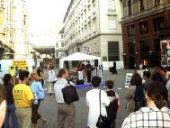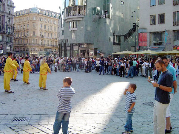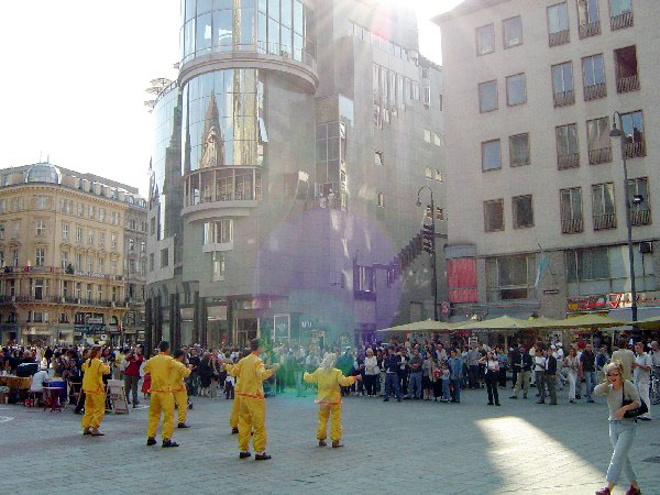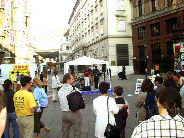 一个由奥地利弟子组成的乐队在斯蒂芬广场上举办了一个露天音乐会,内容主要是他们自己作词作曲的音乐作品,包括呼吁停止在中国对法轮功弟子的镇压,以及他们感受到的大法的美好。