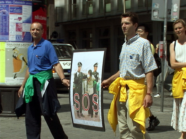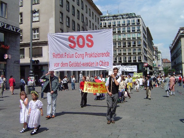 来自奥地利各地及斯洛伐克的弟子环绕维也纳市中心举行了SOS游行。游行队伍途经维也纳歌剧院、霍夫堡皇宫、英雄广场、施蒂芬教堂等游人聚集的景点,格外令人注目,许多路人大声读着横幅上的字,纷纷索取资料了解。更有些华人游客惊奇地看到这么多修炼法轮功的人以及“全球公审江泽民”等横幅。游行队伍抵达施蒂芬广场后,开始了在市中心的功法表演、书法表演、露天音乐会等各种形式的活动。