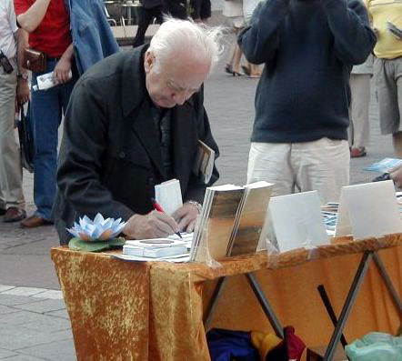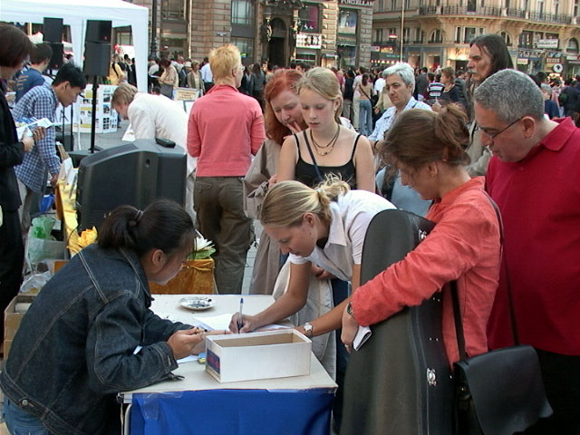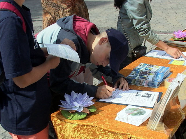 6名法轮功弟子穿着中式炼功服装演示功法。整齐、祥和的功法表演吸引了上百人观看。许多游客纷纷拍照、摄像,记录下这美好的景象。旁边有弟子用广播介绍功法,并讲述这样和平、有益身心的功法在中国受到残酷的真相,呼吁人们共同来制止这样的国家恐怖行为。了解了真象的人们纷纷在呼吁释放法轮功学员熊伟的信上签名并祝大法弟子们成功。下午有几分钟突然大雨点落下来,一个表示支持我们的过路人毫不犹豫的脱下长围巾,不顾自己被淋湿,盖在桌上的签名信和真象资料上。一位从中国大陆来的华人说,在中国许多人心里都明白法轮功学员是无辜的,甚至他认识的一些警察都不愿做迫害法轮功学员的坏事。