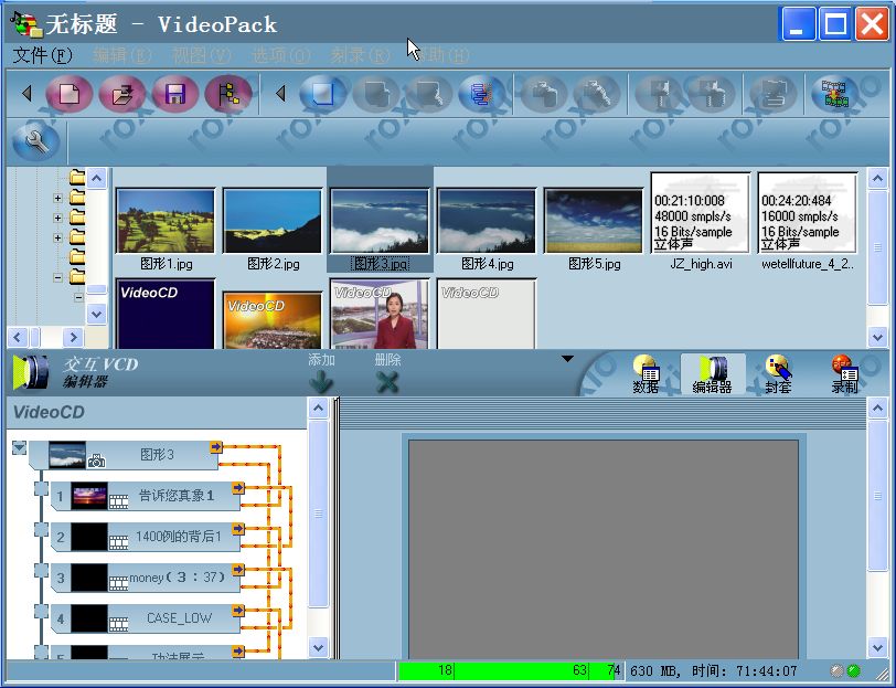 用于播放的视频和音频文件,如DAT文件,MPG文件等可一个一个的加入其中,这与一般的软件没什么两样。最关键的是一个“路由”的设置。它是用来设置哪一个文件先播放,哪一个后播放。即,是用来设置播放秩序的。点按“路由”按钮,左下面窗口各个文件之间会有一条橙色的线条,里面有红色的箭头在走动。可以用鼠标拖动而改变线条的走向。记住:红箭头是怎么走的,最后VCD就是按照那样的顺序播放的。多试几次后就可掌握。
