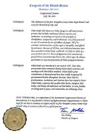 鉴于,法轮大法于1997年传入本州。从那以后,学员们一直不断地和他们的邻里乡亲分享法轮大法的功法和教导。法轮大法对宾夕法尼亚州的贡献获得了全州各地政府领导人的认同。为表彰法轮大法净化人们的心灵,强健人们的身体,以及祛除人们多年的不良瘾好和坏习惯,[宾州]已向法轮功颁发了60多项[褒奖]公告、决议和嘉奖令。相应地,使家庭更加和睦,社区更加崇尚美德。