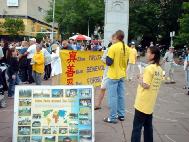 情况。CBC的一位女记者路过时拿到了学员们递过的传单,之后她打电话向学员询问有关情况,表示有兴趣报导法轮功学员历经四年风雨仍傲然挺立、且把迫害元凶江泽民告上国际法庭的故事。