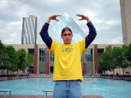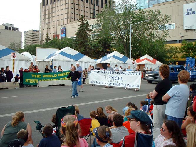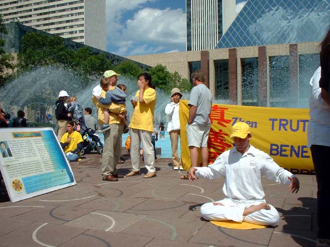 【明慧网2003年7月19日】七月十七日,一年一度的“淘金节”又一次拉开了帷幕,埃德蒙顿市民们纷纷涌上街头,观看游行、表演及享受各种娱乐、购物的乐趣。埃德蒙顿的法轮功学员们利用这大好的机会,来到市政府大楼前演示功法、派发传单,向人们展示法轮大法的美好。人们在尽兴玩耍之余,惊奇地看到法轮功学员们和平、优美的炼功动作,祥和、宁静的慈悲之场,纷纷过来索要传单,询问有关中国政府对法轮功的