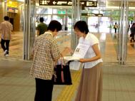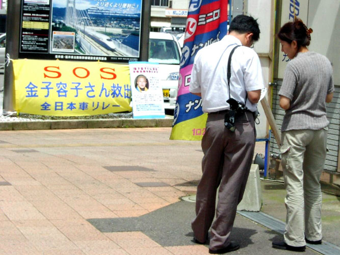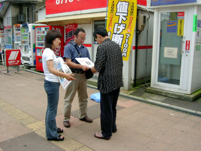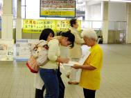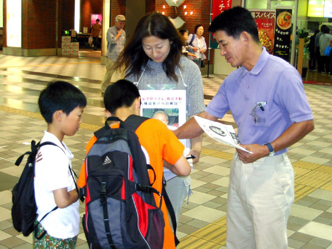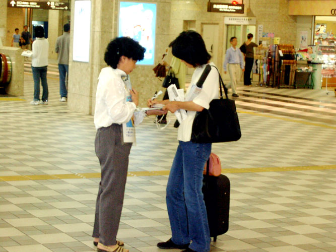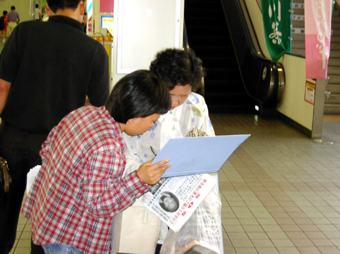 第二天,不巧下起雨了。签名活动地点是日本国营铁路岐阜站前。由于无法在户外展开活动,学员们便去和车站站长联系,要求在车站大厅内展开签名活动。一般而言,在日本车站是很难被允准展开此类活动的。但学员们不受常人观念束缚,由一位学员去和站长交涉,其他学员在外面发正念。在交涉的学员尚未回来时,有的学员在发正念中已经切实感受到事情得到解决了。果然,在交涉的学员向站长讲明目前在中国大陆法轮功学员所遭遇到的残酷迫害以及金子容子被无辜关押的真象,以及江××在美国受到起诉的真象后,站长爽快地答应了学员的要求。
