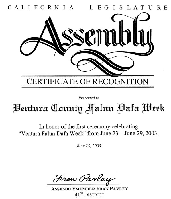 致文图拉(Ventura)郡法轮大法周的荣誉证书