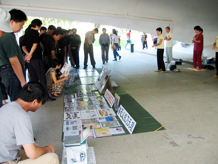 中午12点整,广场上展现出一派肃然。中英文“正义法庭”几个大字,正居中心,身着法官,律师服装的西人法轮功学员主持了对迫害法轮功的罪魁祸首──江××的审判。约有近十位中西方的法轮功学员轮番以大量自身的以及国内亲人,朋友被迫害的事实,揭露了江氏集团对法轮功的残酷迫害。一桩桩,一条条历历报案。这时正值午餐时分,附近的政府机构工作人员以及路人都加入进来,一边吃着便当,一边倾听这震惊人心的控诉。人们纷纷观看展板,索取真相资料。更有许多游客拍下这有意义的场面,相信他们会和他们的亲朋好友们分享。