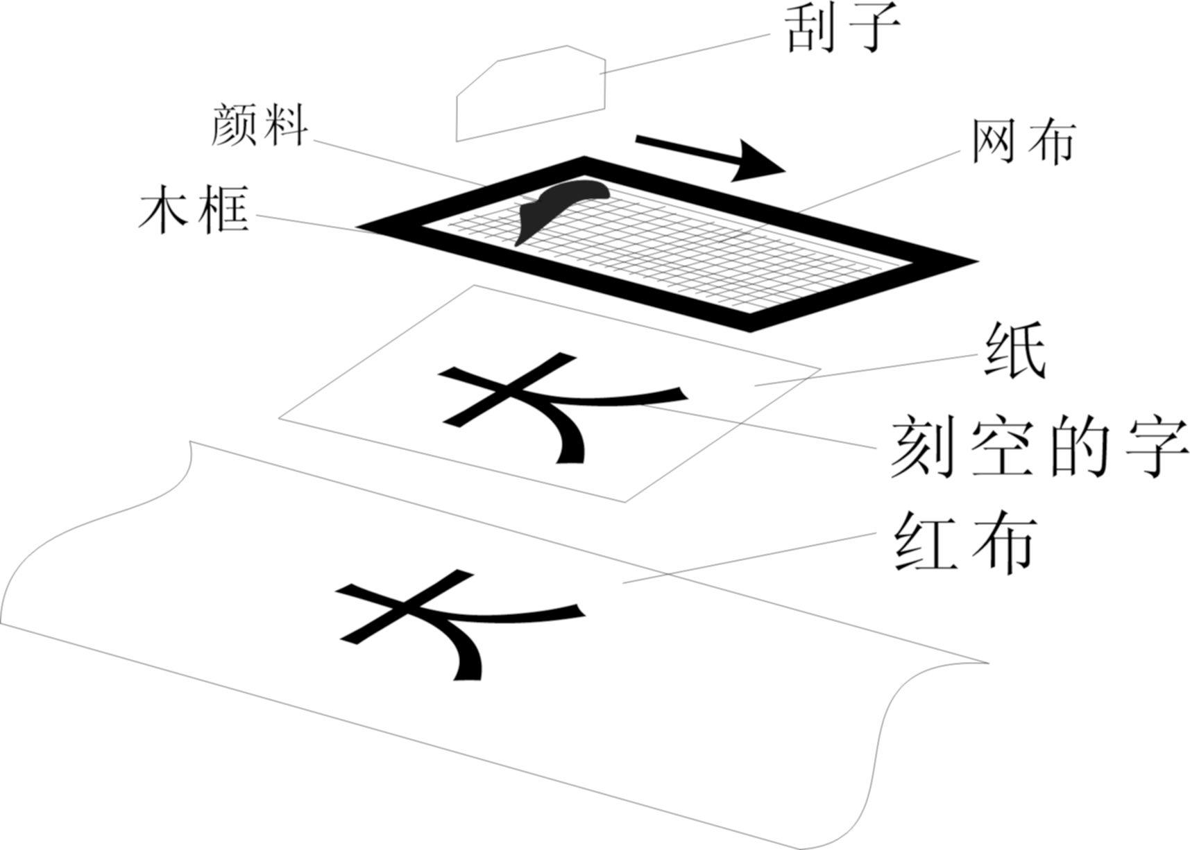 4、 各物品的放置顺序如图所示,将颜料倒在筛网上,按在布上按箭头方向刮即可,如要在布的下面垫上一层海棉效果会更好。