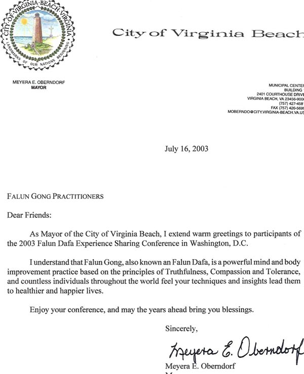 作为佛吉尼亚海滩市市长,我向参加2003年华盛顿DC法轮大法心得交流会的与会者表示诚挚的欢迎。