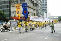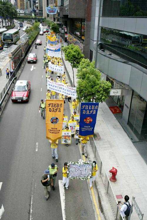 静坐行动直至上午11时半结束。正午十二时许,约二百名法轮功学员由港岛湾仔税务大楼出发游行到中环政府总部。晚上举行烛光晚会。