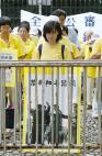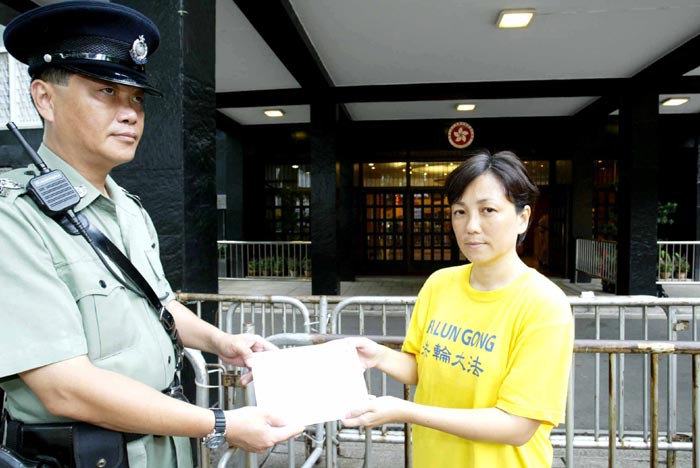 | 没有口号,只有标语,法轮功学员在政府总部前向中央政府作无声抗议 | 法轮功学员递交请愿信,警员转交予香港特首董建华、中国国家主席胡锦涛和总理温家宝 |
