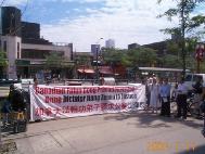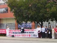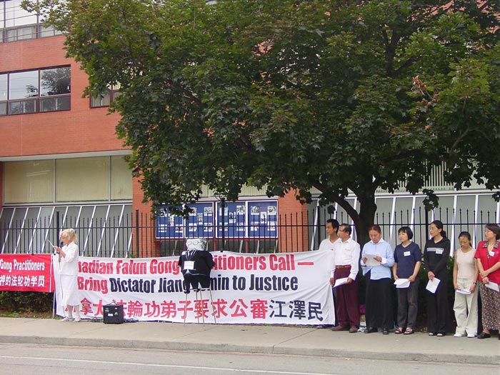 | 在多伦多中区唐人街热闹地区“公审江××” | 在多伦多中领馆前中西方学员作为证人揭露江××的罪行 | 在安大略省政府前的“人心道义法庭”上,法官宣布:证据确凿,江泽民有罪。记者争相拍照 |