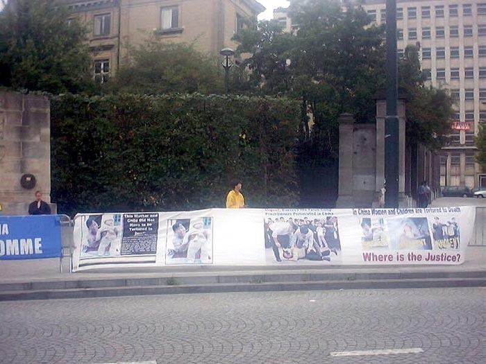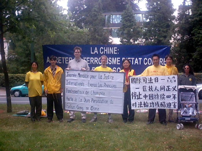 【明慧网2003年7月21日】7月17日是世界司法日,旨在推动国际司法系统以制止本世纪绵延不断的人权犯罪,维护人类尊严。而7月20日则是江××发动的邪恶运动──镇压法轮功的四年见证。比利时大法弟子于该日获比利时警方准许在中国领馆和比利时最高法院前请愿,要求立即停止在中国持续四年的对法轮功群众的残酷