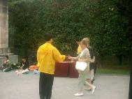 过往车辆和行人都怀着极大的兴趣观看横幅和悬挂的图片。一些人很认真地聆听学员