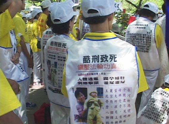 之后,大法弟子们精神抖擞地出发游行。此次游行的路线安排得很好,行经高雄市五大百货公司人潮众多的地方,各地区学员分别穿着”公审江泽民”、”迫害事例”及”法轮大法好”的背心,手拿着各式活动布条进行游行,扶老携幼、祥和壮观的场面令高雄市民印象深刻。