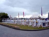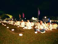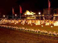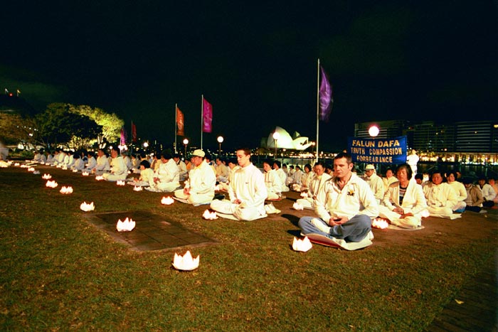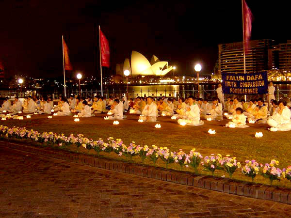 【明慧网2003年7月22日】2003年7月20日早晨4点半钟,悉尼的180多名法轮功学员身着素装,来到市中心的环型码头。他们自动地排好整齐的队伍,庄严,肃穆地坐在绿草地上。每人前面一朵白色的莲花,耀眼的烛光在每一朵花中跳跃着。每一个学员的心中都默默地呼吁停止江泽民一伙对法轮功的残酷;悼念那些为了正义,为了人类的希望而失去了宝贵生命的法轮功学员;呼吁援救那些仍然在中国遭受迫害的学员及其澳洲学员的家属。