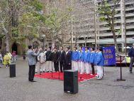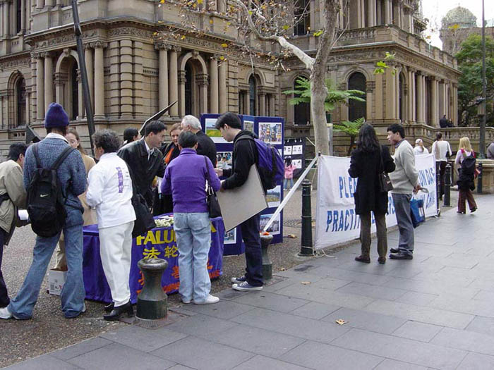 中午12点钟,法轮功学员,各界民主代表,法轮功的支持者均来到市中心的TownHall广场,举行了大型集会。会议由纽省最大地区电台之一2NSB的主持人史蒂文-辛(Mr. Stephen Sim)主持。发言的有:“追查迫害法轮功国际组织”澳洲分部发言人刘松发博士,法轮功团体发言人约翰-戴乐(Mr. John Dellar),中国劳工党主席方圆先生,民主中国阵线总部理事秦晋先生,民主中国阵线总部监事张小刚博士, 纽省上议院民主党议员阿瑟(The Hon. Dr. Arthur Chesterfid-Evans)先生,法轮功学员代表理查德-陈(Richard Chen)先生。他们的讲演都有一个共同的愿望:希望澳洲政府把澳洲各界人士对中国人权状况的关注,对江泽民一伙对法轮功长达四年的残酷迫害的关注传达给中国政府,也希望中澳人权对话有一个实质性的突破。法轮功团体发言人约翰-戴乐先生还把江泽民一伙被以“群体灭绝罪”告上世界各国法庭的消息告诉了澳洲社会。