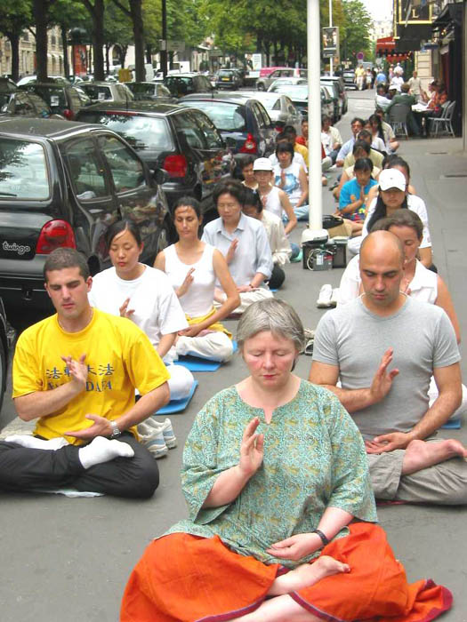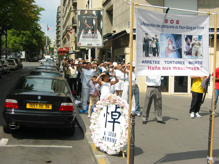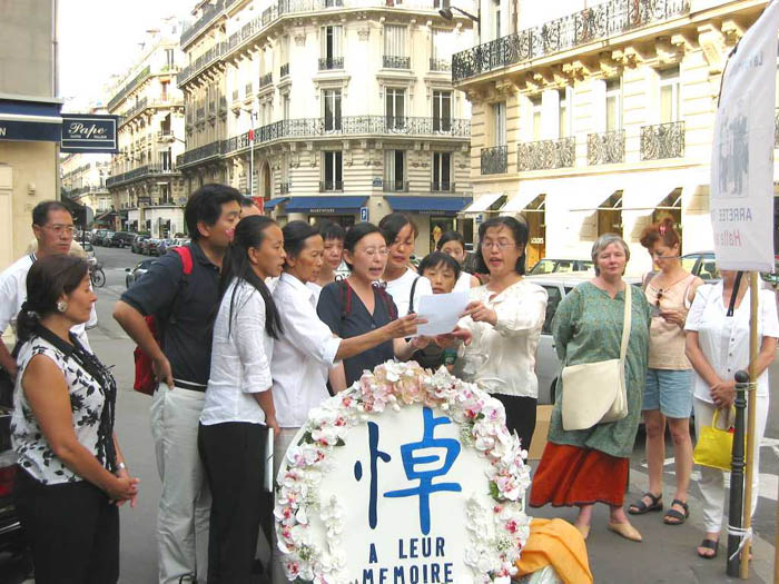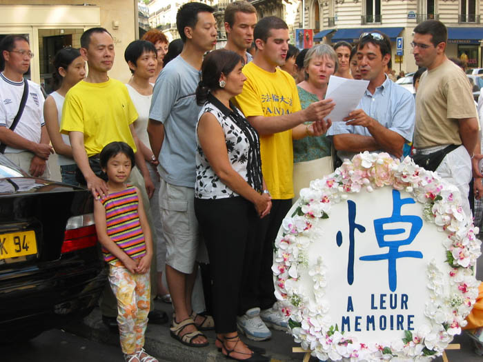 十几个学员分别用中、法文齐声朗读声明,过往车辆的喧嚣声也降低了,行人们清楚地听到了正义的声音。
