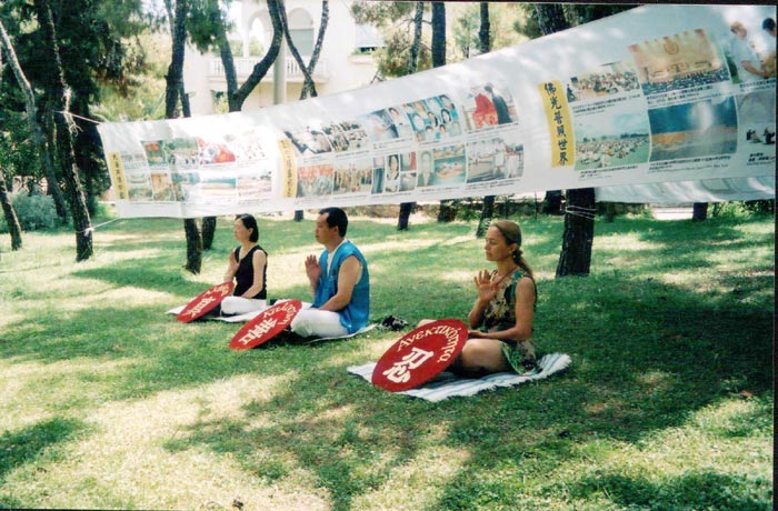 【明慧网2003年7月24日】7月20日,希腊首都雅典。大法弟子来到中国大使馆前抗议江泽民集团对法轮功的历时四年的血腥镇压。使馆大门紧闭。大法弟子们发正念,坚定地清除另外空间一切邪恶旧势力对大法及众生的