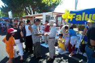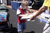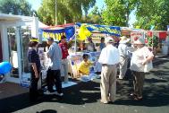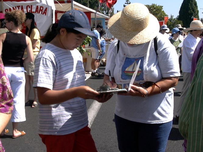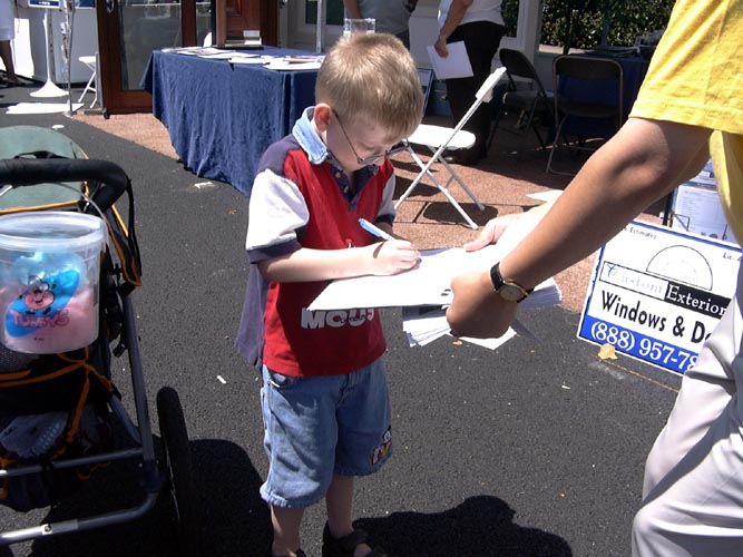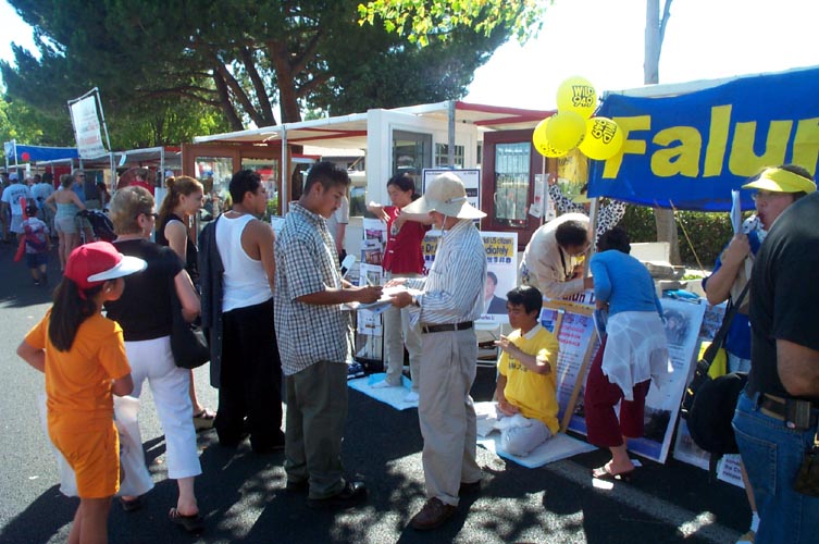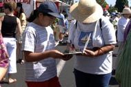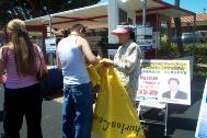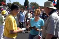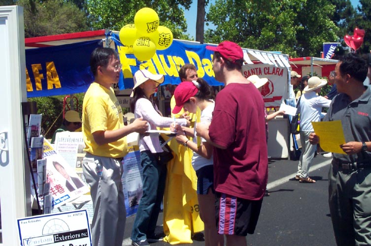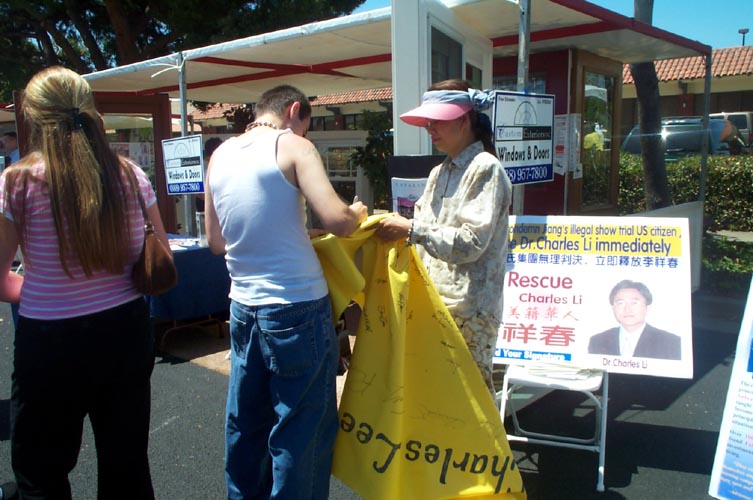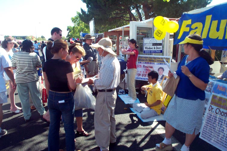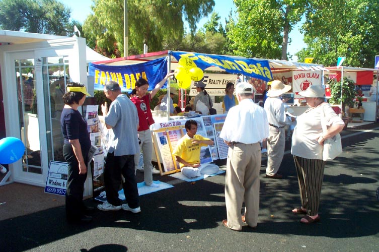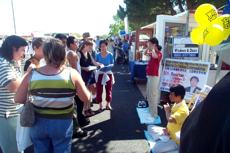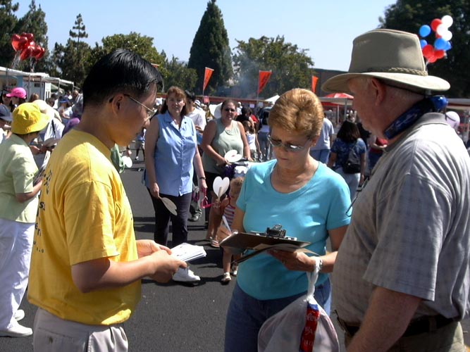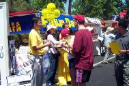 有的学员发材料、讲真相、征集签名,还有的学员打坐炼功进行功法演示。路人纷纷停住了脚步,好奇地观看在喧闹声中的宁静安详的打坐。一位来自弗莱斯诺(Fresno)市的女士在仔细阅读了展板上的真象材料后,马上在签名簿上签了字。她说她坚决反对中国政府对法轮功的镇压。并寻问弗莱斯诺市有没有地方可以学功。她离开我们的摊位后,不久又折返回来说:“我建议你们在这里放一块展板,上面写着‘中国政府违反人权,请帮助中国人民得到自由’。”她说这样就会有更多的人来签名支持。