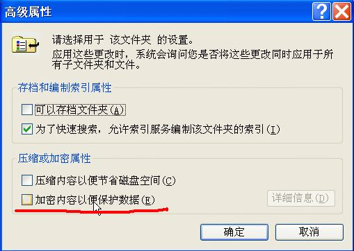 2、进入文件所在文件夹,若把该文件夹下所有文件进行加密,需要点击该文件夹之右键,打开“属性”,在“常规”项中点击“高级”;出现“高级属性”,点击“加密内容以便保护内容”项,然后点击确定见图1;这时会返回到“属性”界面,再次确定后,出现“确认属性更改”对话框,选择“将更改应用于该文件夹、子文件夹和文件”,然后确定。这时已经完成对该文件夹内所有文件的加密。