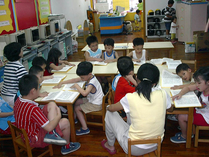 托儿所的卢园长和先生多年前就有毕业生家长向他们推荐法轮大法,然而由于因缘关系,直到今年才一家得法。年初卢园长得法后,随即在园所内推广大法。每天早上由附近学员轮流义务来协助带孩子学法,中午带孩子炼功。卢园长甚至将托儿所的名称由原来的“豆豆托儿所”改为“明慧学校豆豆园”,利用自己的条件证实大法。在这群孩子们的身上我们感受到了大法的力量:孩子们彼此之间都能用「失德」「损德」「白色物质」「黑色物质」的道理来约束自己的行为,老师平常在课程上用「替别人着想」「先看看自己哪做不好」来教导孩子。