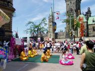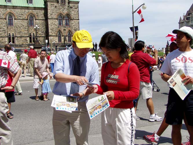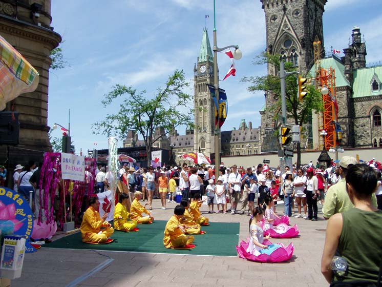 法轮功学员获准在国会山东侧一显著和热闹地段于国庆日上演一台颇具中国特色的古典舞、民族舞、武术表演、古筝演奏、功法展示等节目,吸引了上万的来首都欢度国庆的游客,人们纷纷驻足观看……来自加拿大渥太华和多伦多等地的法轮功学员的演出成了庆祝活动的焦点之一,掌声、喝彩声不断。一位来自中国的加拿大居民表示,法轮功以民族艺术的形式向加拿大社会展示东方文化的美好,这种方式值得称道。一位西人观看节目后说,“法轮功表演的节目是今天最好的!”
