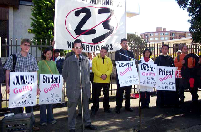 方圆先生说:“我受中国工党的委托来参加此次表达我们对中共把23条强加给香港6百万同胞的抗议大集会。六年前香港回归,我们对它有一种期盼,希望中国大陆香港化。香港在99年的民主自由的理念之下能够对长期封闭统治中国打开一个窗口,起一个潜移默化的作用。我们很担心的是香港大陆化,遗憾的是这种担心变成了现实。不是大陆香港化而是香港大陆化。就象SARS本身是天灾加上人祸所造成的,而23条是典型的人祸造成的,是钳制舆论、言论的结果,把中国大陆封闭式的统治搬到香港。这种人祸的之惨烈超过一种疾病对人类的危害,23条将给香港带来比SARS更厉害的灾难。”