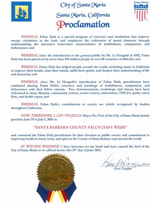 并表彰法轮大法学员对公众服务所作出的贡献,及为圣塔芭芭拉郡(Santa Barbara)和全世界人民的身心健康及思想升华所作出的努力。