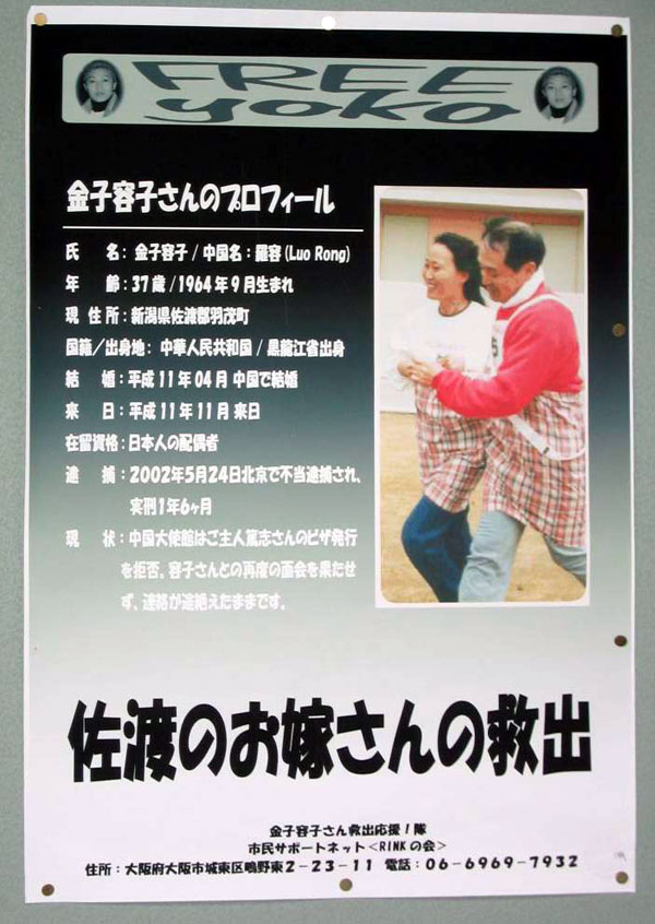 金子容子女士是于1999年与金子笃志结婚,同年来到日本新泻县佐渡岛居住。2002年5月24日在北京由于散发法轮功的真象材料,被捕并被劳教一年另六个月。