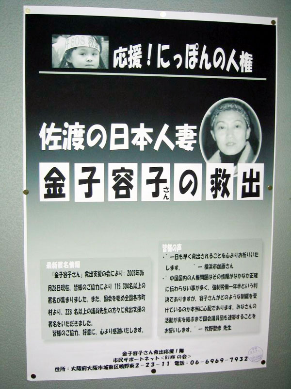 同时,另一个营救金子容子女士的组织「金子容子救援会」最近也在日本各个县进行了广泛的征签及向议会请愿活动。引起了媒体的深切关注。