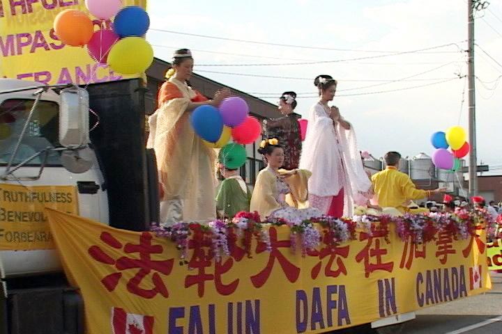 受到观众特别赞赏的队伍是大法学员的阵列,这也是本次游行中人数最多的一个阵列,大法学员的队伍装扮得非常漂亮。前面是一辆大花车,上面坐着多位身着各式唐朝服饰的女子,在悠扬的音乐声中打坐。花车后面紧跟着穿各民族服装的女子,有朝鲜服装,越南服装,印度服装等,后面还有着台湾山地服的女子在跳山地舞,令人有耳目一新之感。随后还有优美的缎带舞阵列,穿着印有“真,善,忍”字样法轮功服装的阵列及穿着漂亮便服的法轮功学员。学员们个个面带微笑,友善地向两侧观众挥手及问候。“加拿大日快乐”的声音此起彼伏。一位西人法轮功学员在队伍边上维持秩序,他那明朗的笑容令人群感到十分亲切。游行经过之处,观众的欢呼声,笑声不断,有的印度观众向队伍合十致意,还有的华人观众激动地大声说“法轮大法好!”一位法轮功学员介绍说:“今天来参加游行的学员有花甲的老人,推婴儿车的母亲,也有学员的家属前来支持,对此次游行我们准备得很精心,我们非常高兴地和大家一起共庆加拿大国庆,同时也向各界展示法轮大法的美好,希望将祥和及喜悦与每个人分享!”