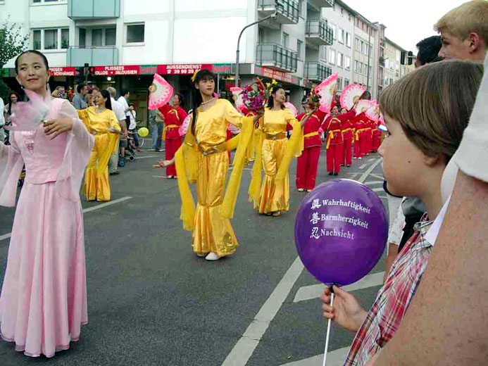参加文化节游行的有约六十个团体,其中之一是一队由德国人和中国人组成的以“中国的文化与修炼”为主题的法轮功修炼者。几个穿着华贵的金黄色中国传统服装的法轮功学员在一辆装饰着中国风景画的彩车上展示功法。美妙的音乐响起,女学员们随之翩翩起舞,一切都是那么和谐。她们身着传统的中国服装,表演几千年来在中国深受喜爱的民间节日庆典舞蹈──扇子舞、姿态各异、美不胜收。不断有孩子拉着父母来看我们的游行。孩子的父母不解地问,为什么法轮功在中国遭到镇压?